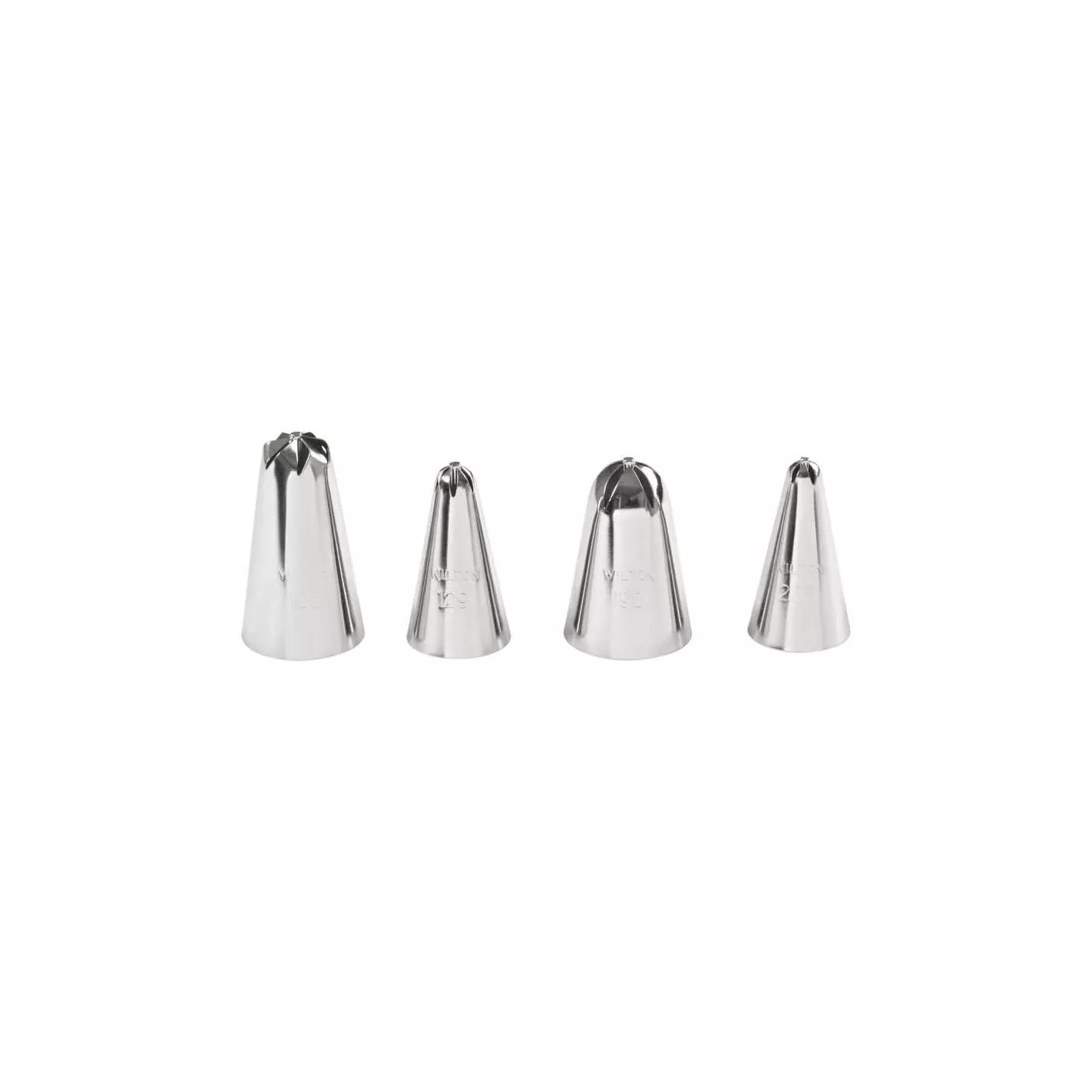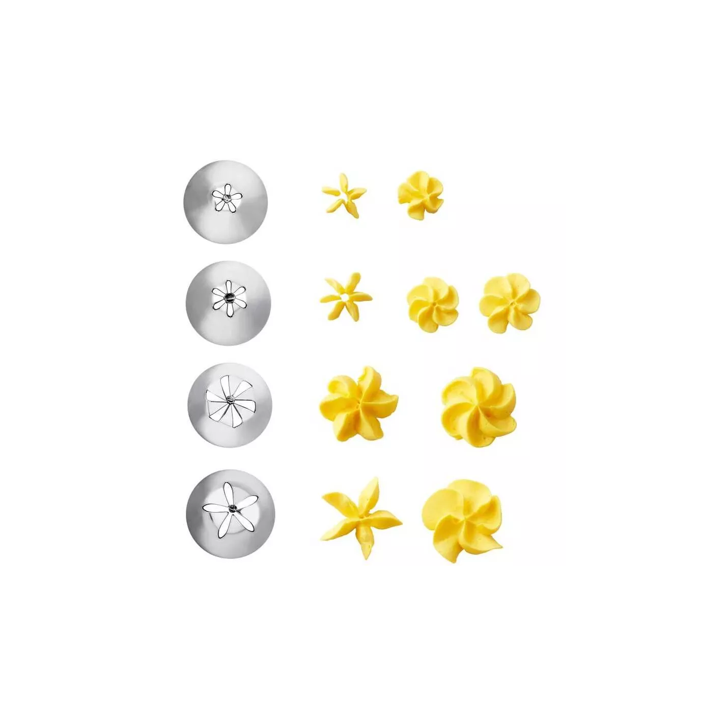 Deja que tu cretividad florezca, coloca un hermoso ramo de crema de mantequilla en un instante con este juego de boquillas de decoración con 4 diseños diferentes para elegir. Agregue decoraciones florales fáciles de colocar a los cupcakes, pasteles, galletas y más. También se puede usar para rosetas, remolinos, bordes y más. Incluye boquillas de flor de gota 109, 129, 190 y 225. Todas las boquillas usan mangas y acoples tamaño estándar. Las boquillas de acero inoxidable están grabadas con sus números para una fácil identificación. Apto para lavavajillas en la rejilla superior.