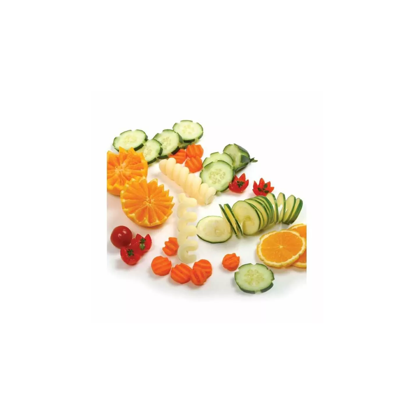 El juego incluye cortador de doble rizo, para rizos de frutas o vegetales, rebanador en espiral, para cintas en espiral, cortador en "v" para bordes en zigzag, cuchillo flexible para el control de la punta de la cuchilla y cortador de arrugas. El cortador de doble rizo es de alambre cromado, todas las demás piezas son de acero inoxidable. Instrucciones incluidas