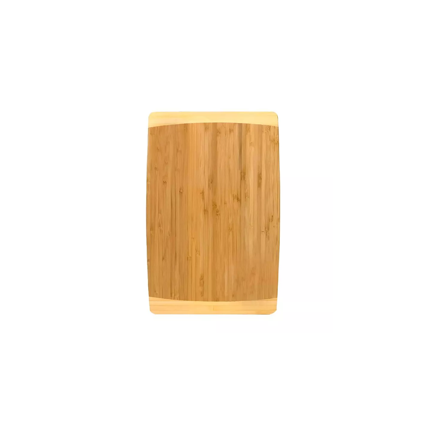 Tabla de madera de bambú que combina dos colores de madera uno claro en sus agarraderas y el oscuro cubre el centro de la tabla. Cuenta con unas medidas de 30 centímetros de ancho y 20 centímetros de profundidad en su mesa de cocina. De la más alta calidad y es resistente a las roturas. La tabla de bambú es amigable con el medio ambiente y absorbe menos líquido y bacterias que las tablas tradicionales