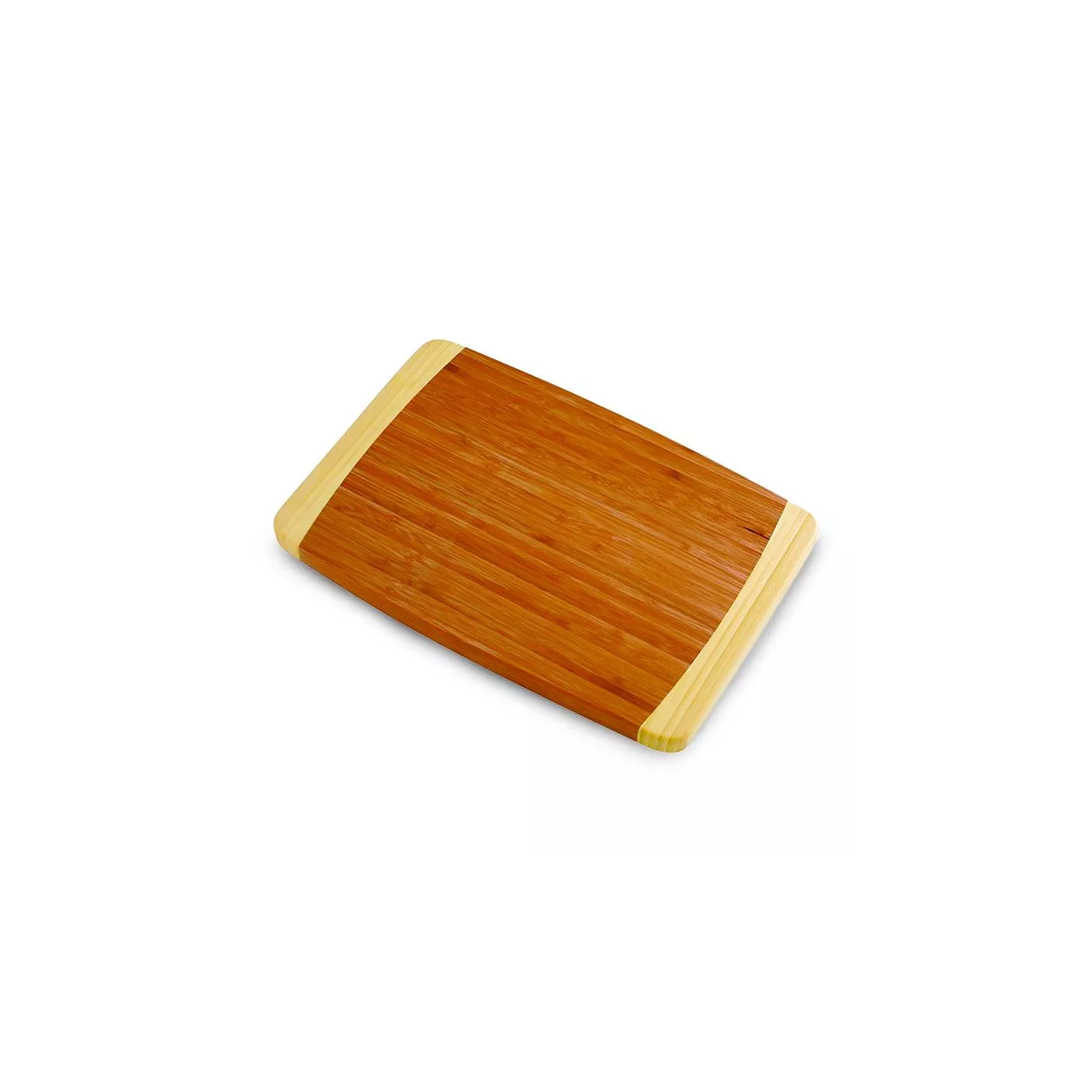 Tabla de madera de bambú que combina dos colores de madera uno claro en sus agarraderas y el oscuro cubre el centro de la tabla. Cuenta con unas medidas de 26 centímetros de ancho y 16 centímetros de profundidad en su mesa de cocina. De la más alta calidad y es resistente a las roturas. La tabla de bambú es amigable con el medio ambiente y absorbe menos líquido y bacterias que las tablas tradicionales