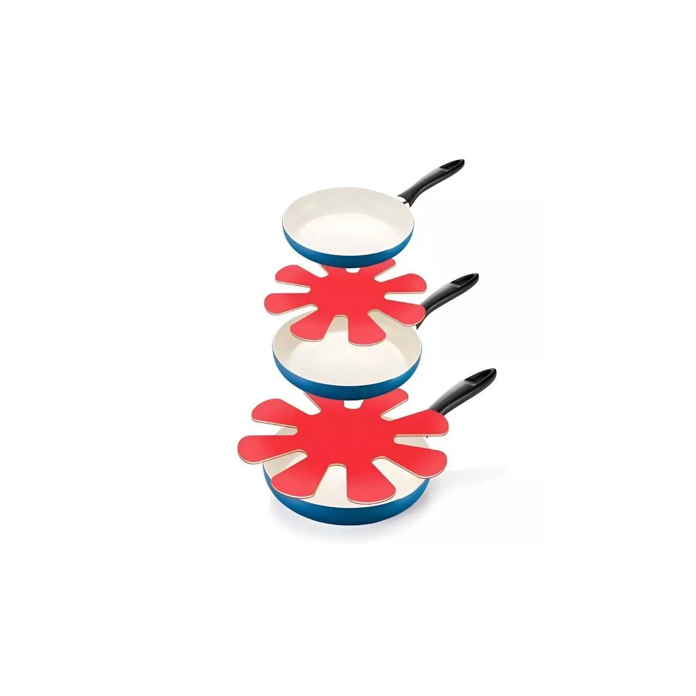 Prácticos protectores diseñados para mantener tus sartenes en perfecto estado al evitar arañazos y daños cuando se almacenan apilados. Esenciales para prolongar la vida útil de tus utensilios de cocina, asegúrate de centrar el protector para máxima cobertura.