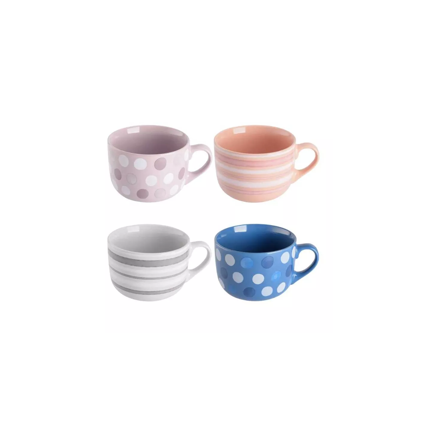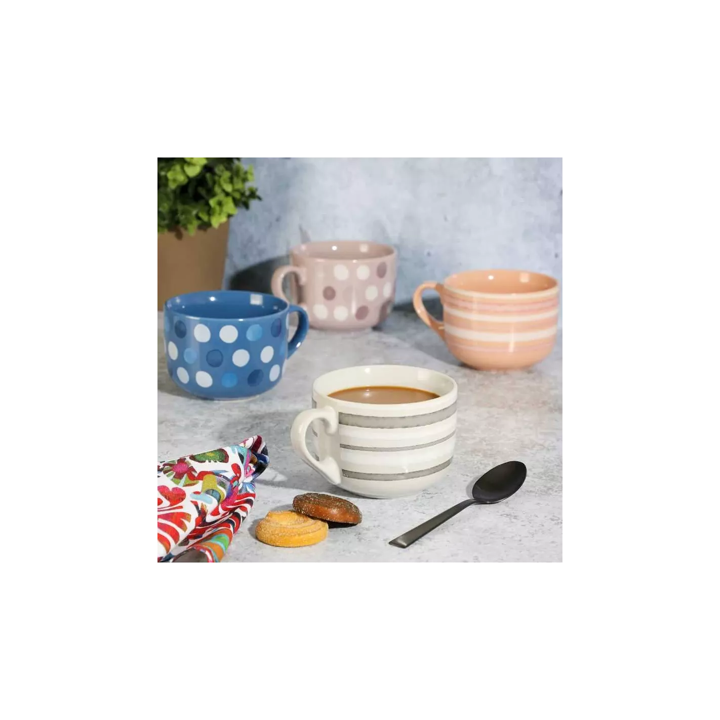 Hecha de cerámica duradera, cada taza presenta una paleta de colores única con un patrón de rayas o lunares. Disfruta de bebidas calientes en invierno, bebidas frías en verano o date un capricho con una taza llena de postres deliciosos.