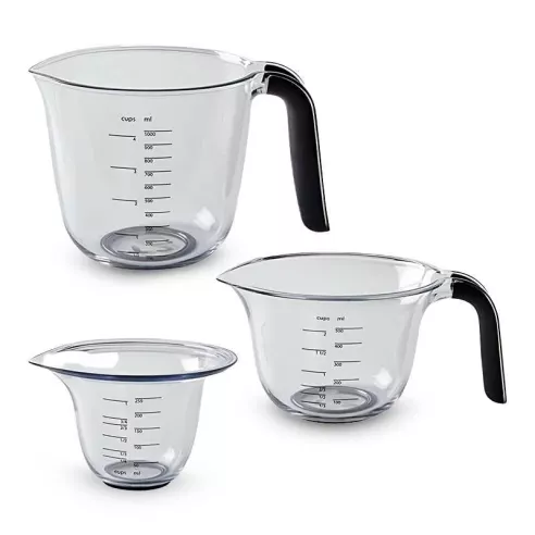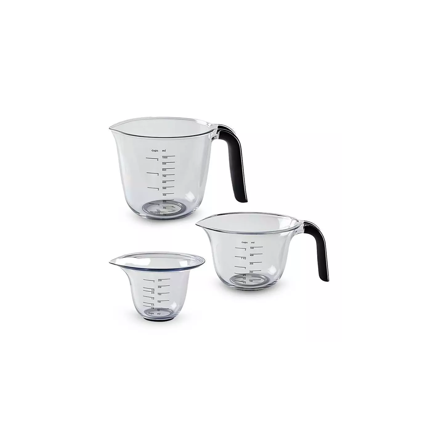 Este juego de jarras medidoras apilables de KitchenAid incluye tres tamaños diferentes: 1 taza (250 ml), 2 tazas (500 ml) y 4 tazas (1000 ml). Las jarras no contienen BPA y cuentan con marcas de medición fáciles de leer tanto en unidades métricas como estadounidenses. Cada jarra cuenta con un pico vertedor integrado para verter de manera fácil y sin complicaciones, y las dos más grandes cuentan con asas antideslizantes. Miden con precisión los ingredientes húmedos y secos y se apilan para un fácil almacenamiento.