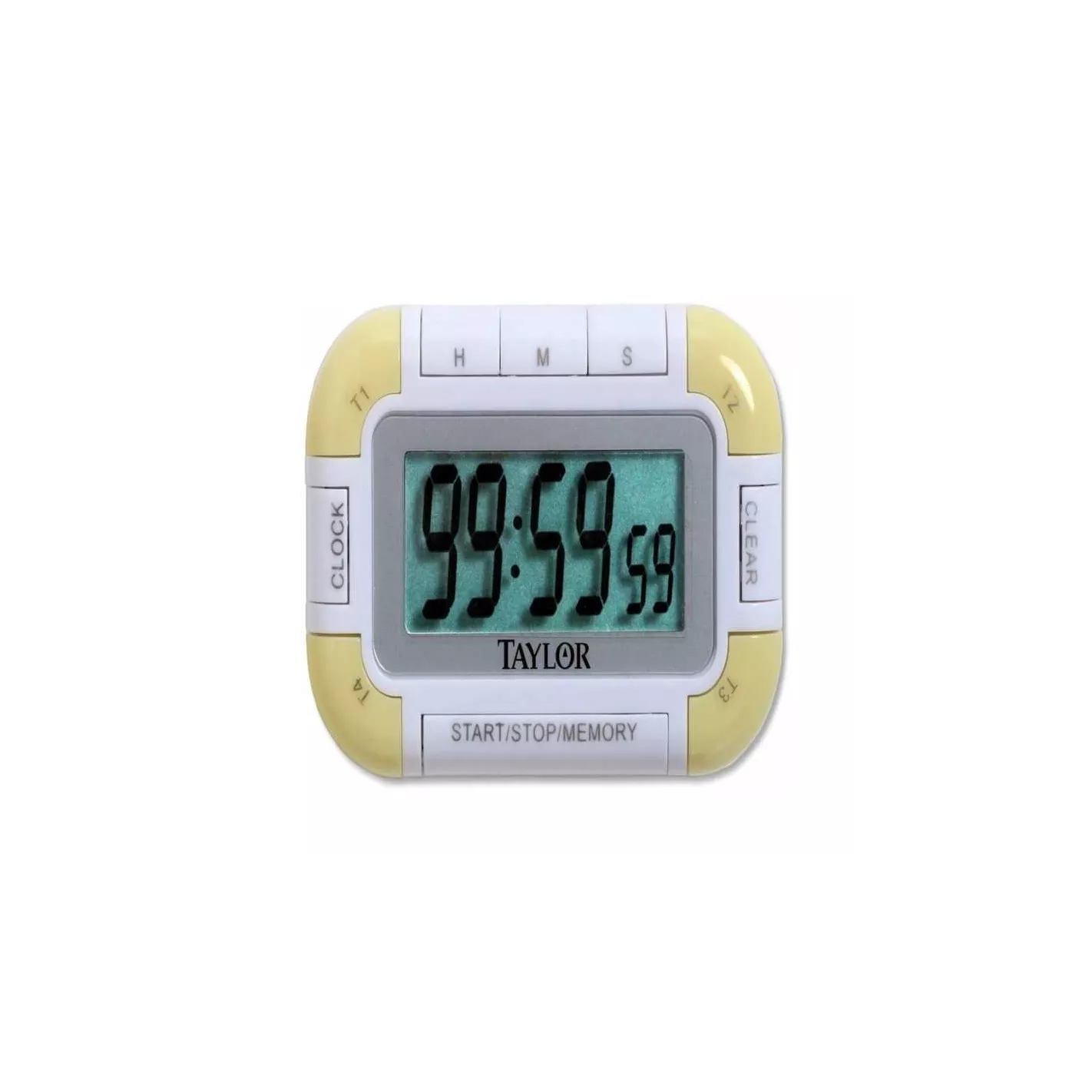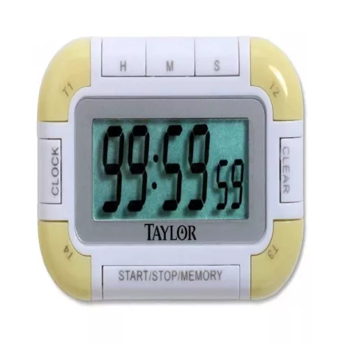 El temporizador de eventos Taylor Digital 4 cronometrará 4 eventos al mismo tiempo, ya sea una cuenta atrás o una cuenta adelante. El temporizador mide hasta 99 horas, 59 minutos, 59 segundos para cada modo de temporizador. Un tono diferente para cada temporizador y una luz de esquina separada se enciende cuando se agota el temporizador seleccionado. El timer también incluye una función de reloj.