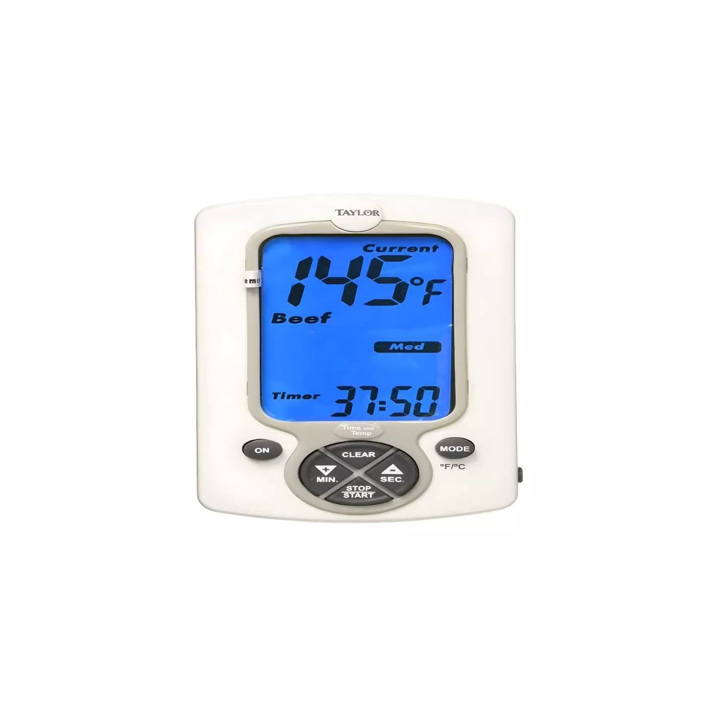 El termómetro y temporizador digital Taylor ofrece resultados superiores tanto para Chefs profesionales como aficionados. Este termómetro digital mide temperaturas de 32° a 392° grados Fahrenheit. Una sonda duradera de acero inoxidable con un cordón de silicona de 4 pies permite monitorear los alimentos sin sacarlos del horno. Las características adicionales incluyen un interruptor de encendido / apagado y una alarma de temperatura programable. Cuenta con una pantalla de pie para uso en la encimera o un imán para colocarlo en la puerta del horno. Requiere dos (2) baterías AAA (incluidas).