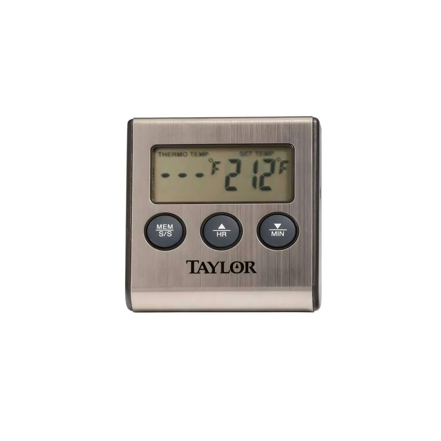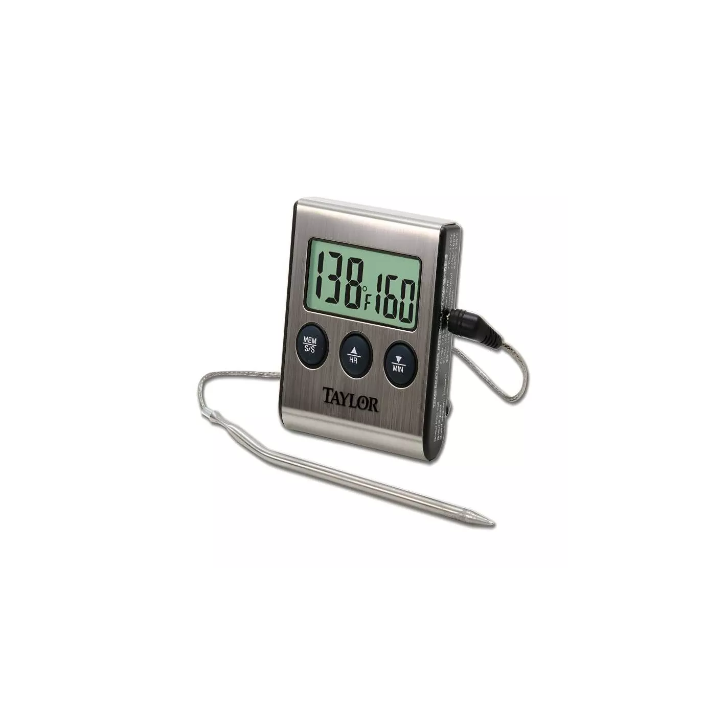 Ajuste este termómetro de acero inoxidable a la temperatura ideal y sonará una alarma cuando se alcance la temperatura. Seleccione fácilmente temperaturas preprogramadas del USDA o su propia temperatura personalizada. El termómetro de cocción / asado digital Taylor con carcasa de acero inoxidable proporciona resultados superiores tanto para chefs profesionales como aficionados. Este termómetro digital mide temperaturas de 30 a 484 grados Fahrenheit. Una sonda de acero inoxidable duradera con un cable de silicona de 4 pies permite controlar los alimentos sin sacarlos del horno. Las características adicionales incluyen una alarma automática de tiempo y temperatura. Cuenta con una pantalla de pie para uso en encimera, o un imán para fijar a la puerta del horno. El termómetro requiere una (1) batería AAA (incluida).