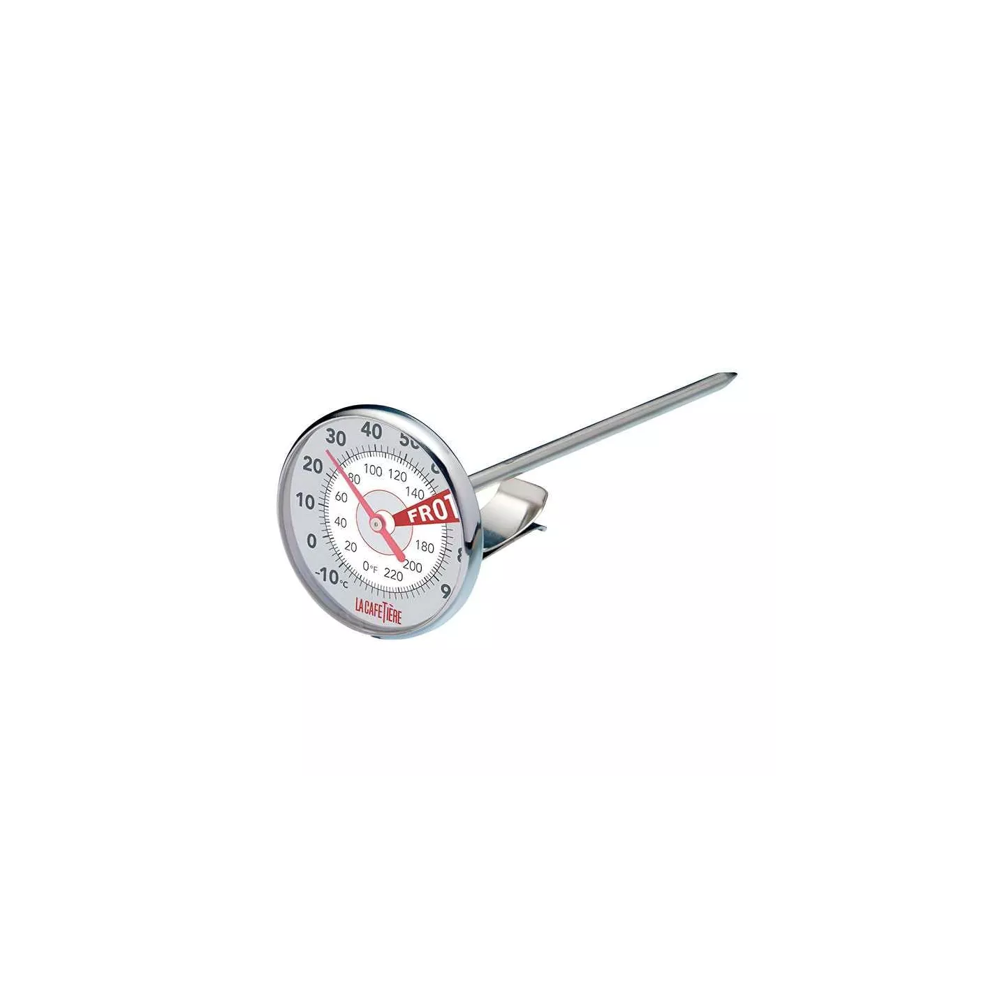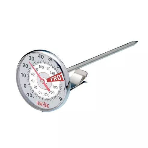 Equípate con este termómetro de temperatura de leche de alta calidad y estarás en el camino correcto para preparar cafés con leche y capuchinos increíbles y espumosos. Estamos hablando de cafés tan esponjosos como a ti te gusten y que harán que los baristas locales se pongan celosos. Lo mejor de todo es que es muy fácil de usar. Simplemente colócalo en la leche y caliéntalo. Cuando el indicador de temperatura de la leche llegue a la zona marcada "FROTH" (espuma), ¡listo! No es necesario adivinar. El termómetro tiene un clip incorporado, por lo que puedes sujetarlo al costado de tu jarra o cacerola. Esto permite lecturas de temperatura con manos libres y mantiene tus manos a salvo de la leche caliente. El dial está claramente marcado con temperaturas de 10 °C a 90 °C (y de 0 °F a 220 °F), por lo que no tendrás que entrecerrar los ojos. Si tienes una máquina de café expreso, puedes usarla con la varilla de vapor.MATERIAL: ACERO INOXIDABLE