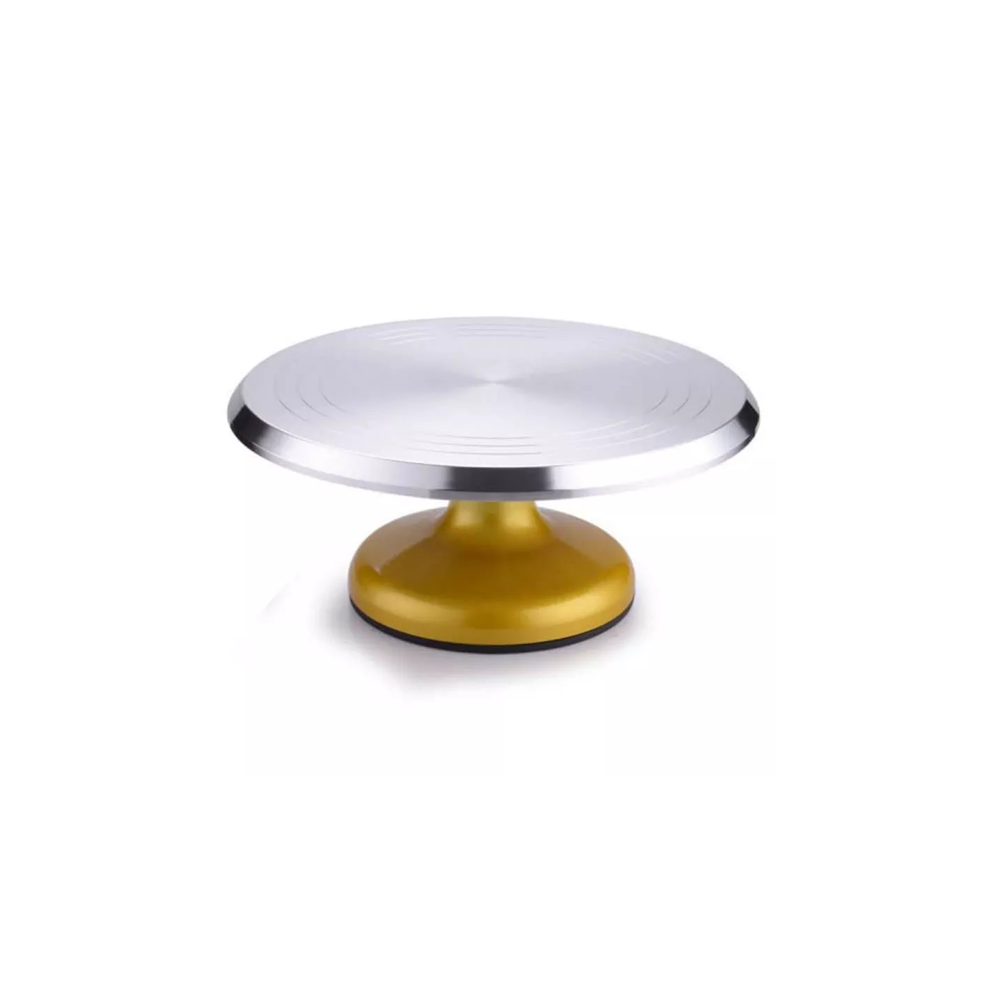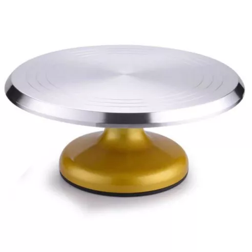 Decore o exhiba fácilmente sus pasteles exclusivos con este soporte giratorio de aluminio para pasteles. Este soporte le permite girar su pastel para que pueda acceder a todos los lados y ángulos para un glaseado y decoración rápidos y simples. Ideal para panaderías, cafeterías, y más.