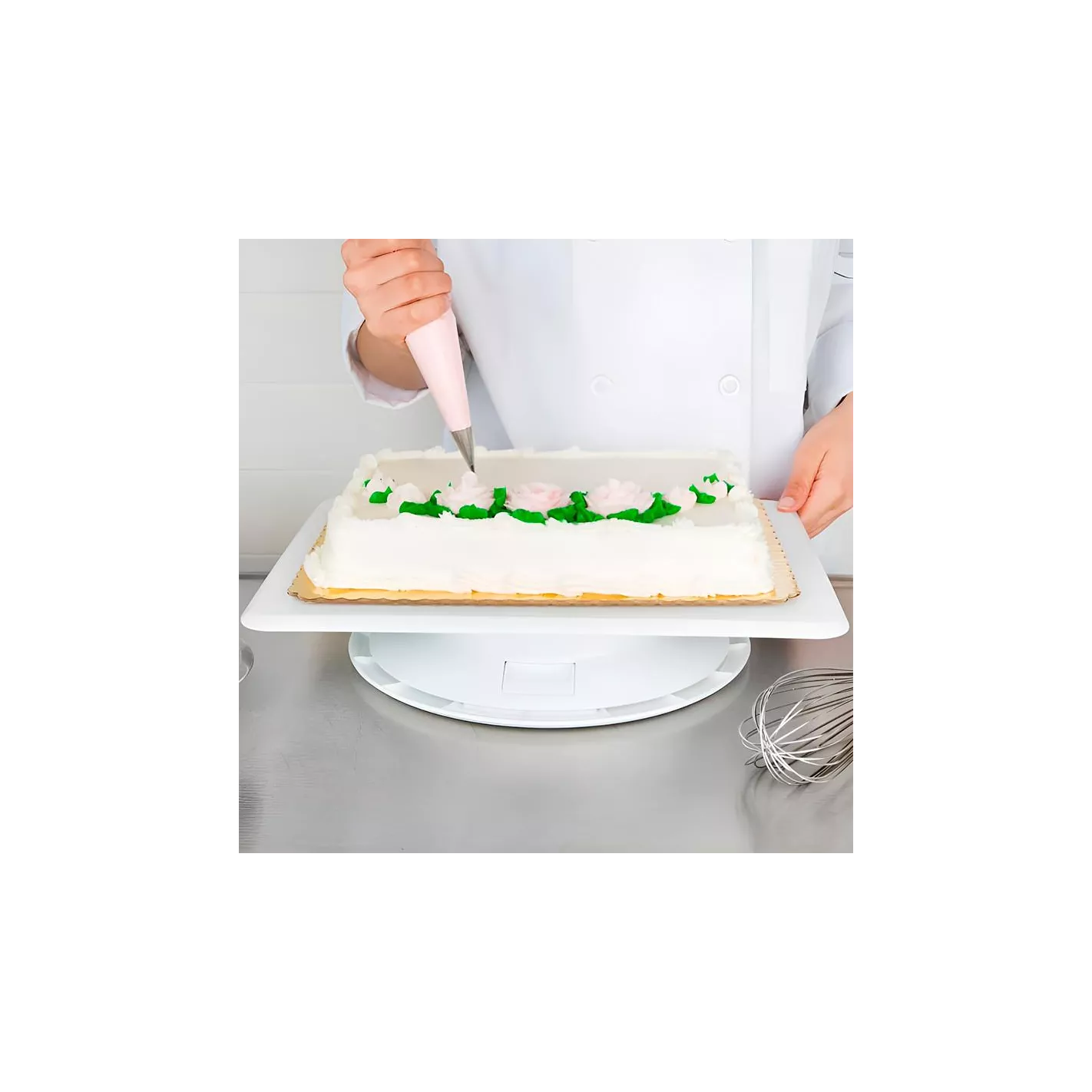 Este soporte le permite girar su pastel mientras lo decora y puede acomodar un pastel circular de hasta 12 pulgadas o un pastel rectangular de 12 x 16 pulgadas. Ideal para panaderías, cafeterías y más, este soporte versátil tiene un lado redondo y rectangular, lo que le permite decorar pasteles en hojas o pasteles redondos con un solo soporte.