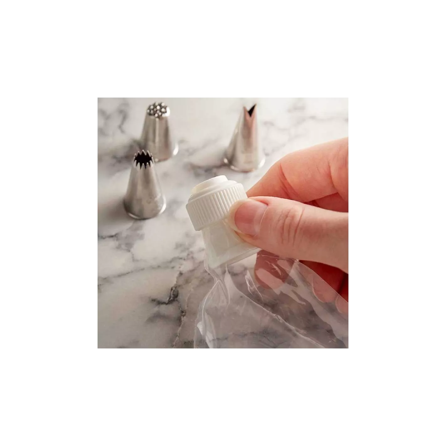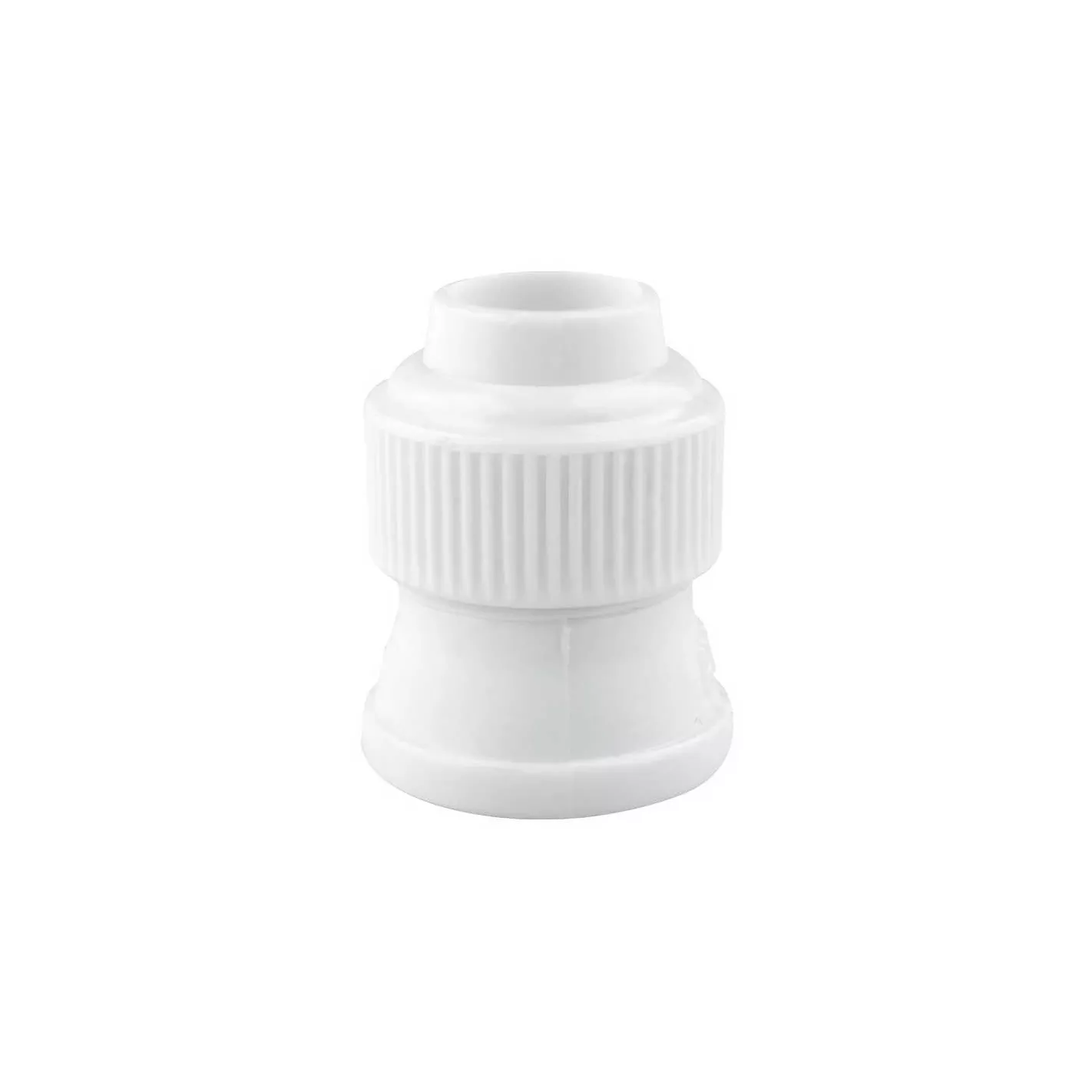 Este acoplador de plástico estándar de 2 piezas Ateco 400 le permite intercambiar puntas de decoración pequeñas / de tamaño estándar con absoluta facilidad. Aunque todas las bolsas reutilizables pueden aceptar pequeñas puntas de decoración sin un acoplador, este práctico artículo le permite cambiar las puntas sin tener que vaciar el contenido de su bolsa de decoración, lo que le ahorra tiempo y trabajo. Para usar este acoplador correctamente, simplemente recorte su bolsa reutilizable antes de usarla. Sin embargo, dado que las bolsas de lona con costura cosida no se pueden recortar, no son compatibles con este artículo. Además, los bordes estriados del anillo le permiten ensamblar fácilmente el acoplador a la base con un mínimo esfuerzo. Este acoplador funciona mejor con boquillas de tamaño estándar que tienen un diámetro inferior de 11/16 pulgadas. Ideal para panaderías, decoradores de pasteles, cafeterías y en cualquier otro lugar donde necesite decorar productos horneados, este acoplador de plástico hará el trabajo.