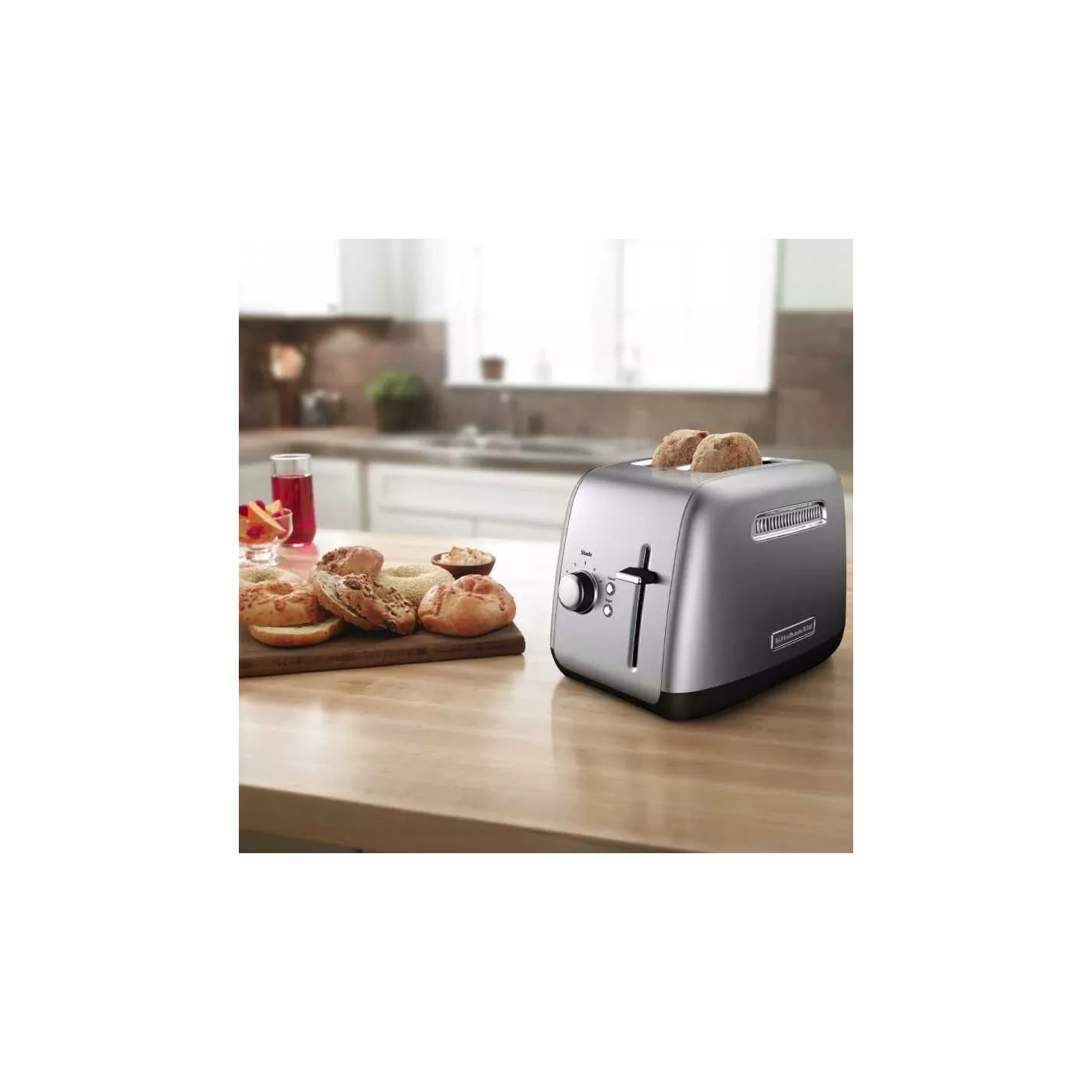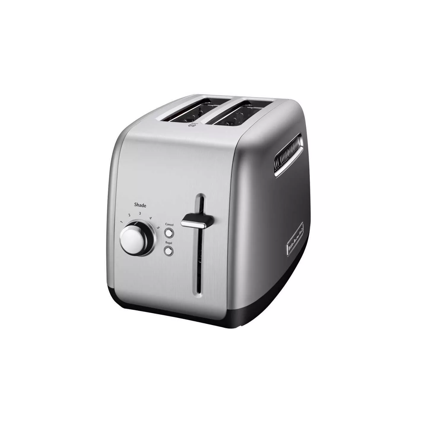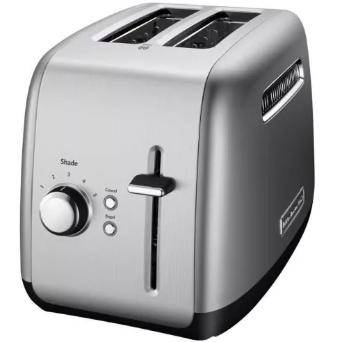 La tostadora KMT2115 de 2 rebanadas de KitchenAid tiene botones de cromo que brillan con luz azul de retroiluminación cuando están en uso. Las ranuras extra anchas aceptarán los bagels, panes o pasteles más gruesos y la cavidad de tostado de acero extra profunda asegura un dorado uniforme. Los bastidores ajustan automáticamente el ancho de la ranura para cortes gruesos o delgados, manteniendo la comida en posición vertical para tostar incluso. Cuando la comida está lista, la palanca de elevación manual facilita sacarla de la tostadora. La selección de la función de tostado de bagel reduce la potencia en un lado de los elementos de calentamiento en un 50% para producir un bagel mejor tostado. Además, la configuración ajustable de 5 colores garantiza que sus alimentos salgan de la forma que desee