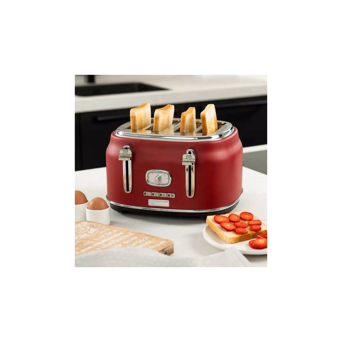 Un aspecto retro para un desayuno delicioso. Es ideal para tostar, ya que te permite elegir el nivel de tostado que tu prefieras. Es apta para toda la familia porque sus 4 ranuras anchas permiten tostar hasta 4 rebanadas a la vez.
