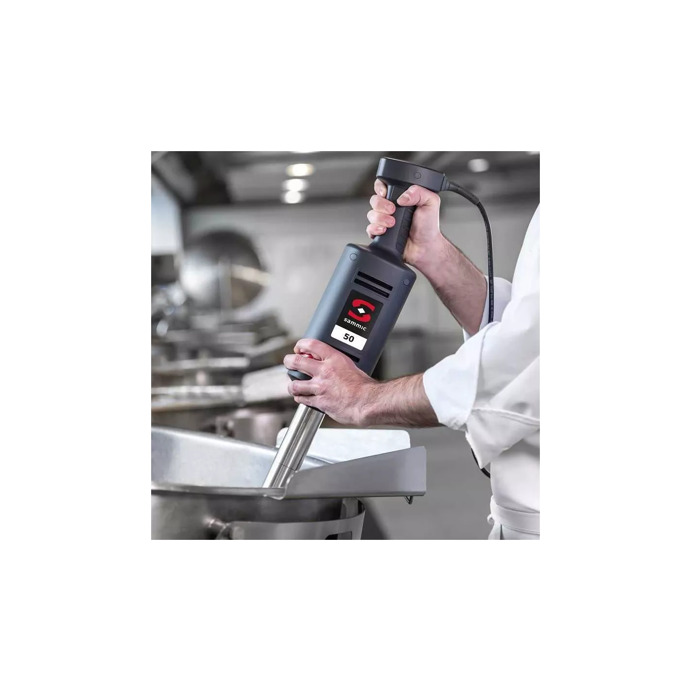 Licuadora de inmersión de alta durabilidad cuenta con un bloque motor de velocidad fija, brazo desmontable de 520 milímetros, diseñado para uso continuo en recipientes de hasta 120 litros.