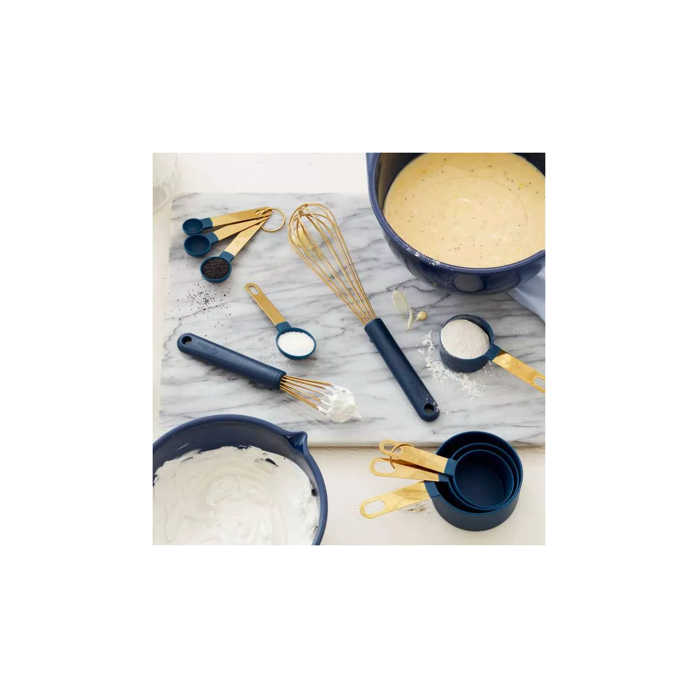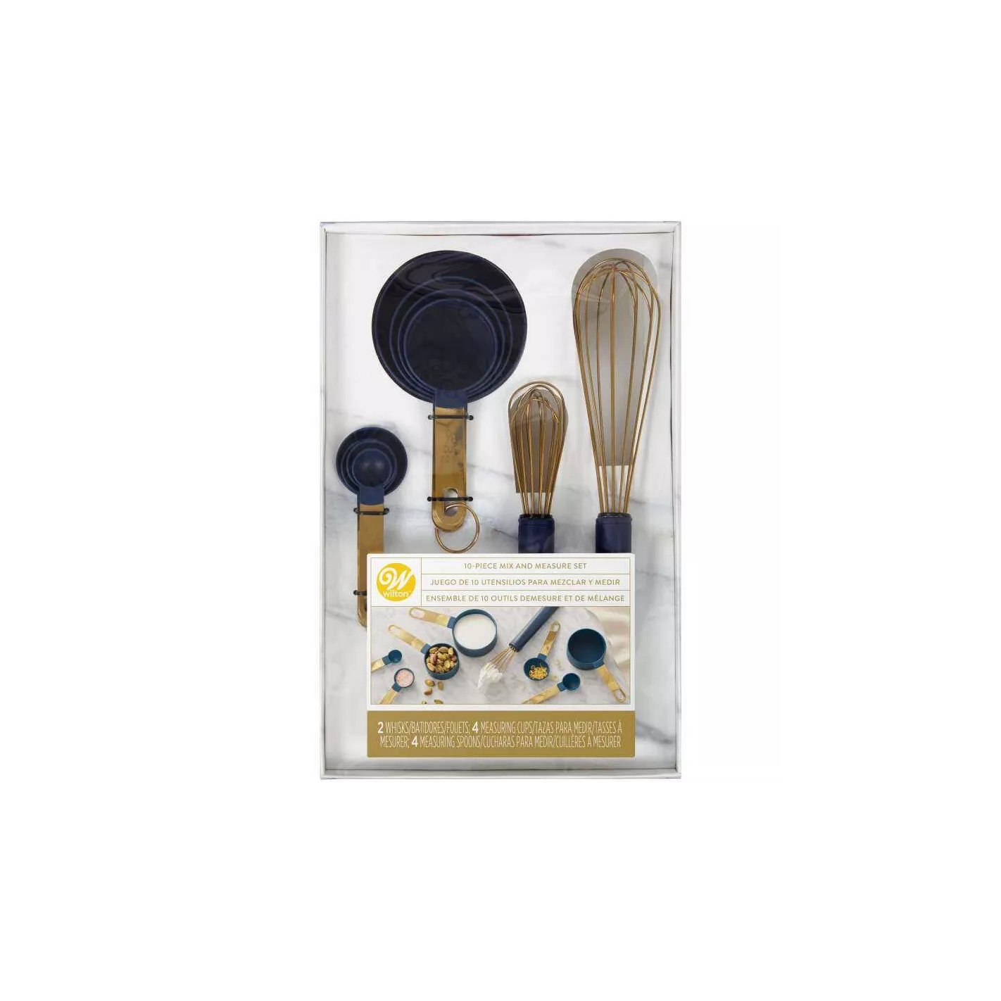 ¿Está buscando el juego de cocina perfecto para un regalo de inauguración? ¿O tal vez un hermoso juego de reemplazo para su propia cocina? Nuestro juego de mezcla y medida lo tiene todo: tazas y cucharas medidoras de hermoso diseño más dos tamaños de batidores para cada trabajo de cocción u horneado, grande o pequeño. Y las elegantes tazas y cucharas de medir se apilan y anidan para un fácil almacenamiento. Este magnífico juego de utensilios de cocina realmente se distingue por su hermoso diseño azul marino y dorado. Seguro que hará que todo lo que hagas en tu cocina se sienta un poco más especial.