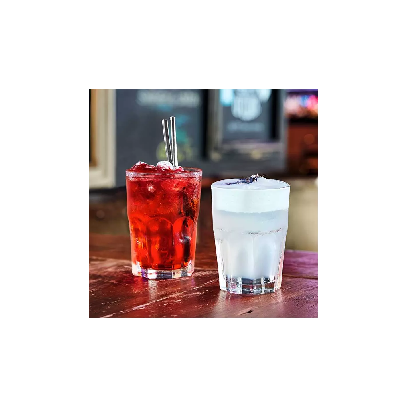 Su atractivo diseño de lados rectos no solo pone el foco en el color de sus tés helados, limonadas o cócteles, sino que también deja un amplio espacio para mezclar y servir bebidas en un solo vaso.