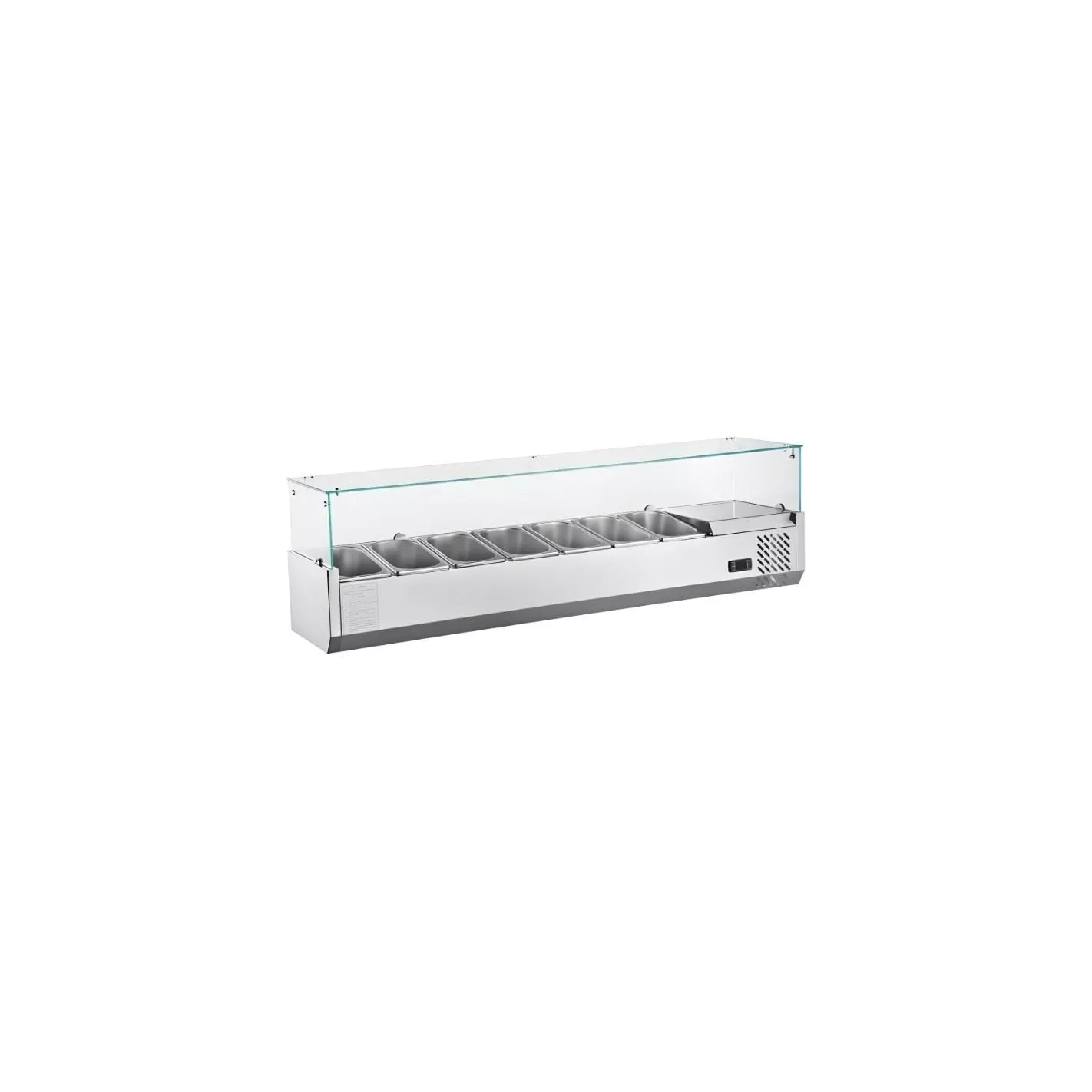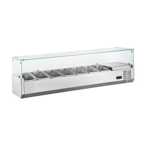 La vitrina refrigerada le permite exhibir ensaladas, toppings, pizzas sobremesa y más de modo que sus clientes reciben productos frescos y visibles para motivar el antojo por sus productos. Quantum Pro le ofrece vitrinas para toppings de un acabo elegante y llamativo. Vitrina de 7 x 1/4 GN color plateada, ideal para restaurantes, hoteles, cafeterías, panaderías y mucho más.